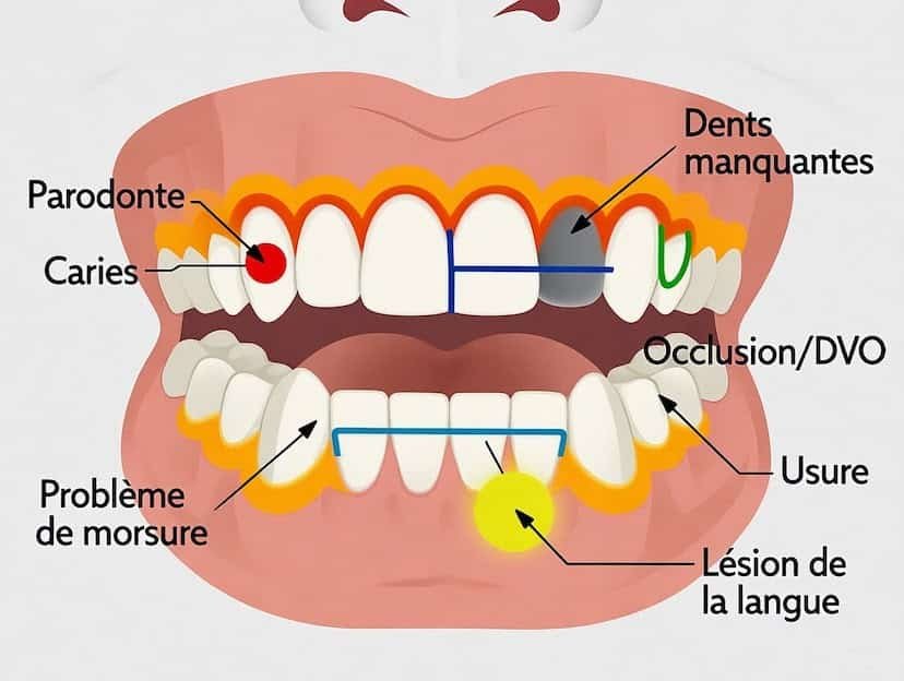 Lorsque des problèmes multiples s’entremêlent – caries étendues, affections parodontales (inflammation des gencives et de l’os), désalignements orthodontiques, dents manquantes ou usure affectant la dimension verticale d’occlusion (DVO) – nous orchestrons une stratégie multidisciplinaire. Cela peut inclure des implants pour remplacer les absences, des bridges ou couronnes pour renforcer, et des ajustements pour corriger l’occlusion. Cette complexité nécessite une planification précise, mais elle transforme radicalement votre confort masticatoire et votre apparence, comme reconstruire un puzzle pour une image claire et confiante.